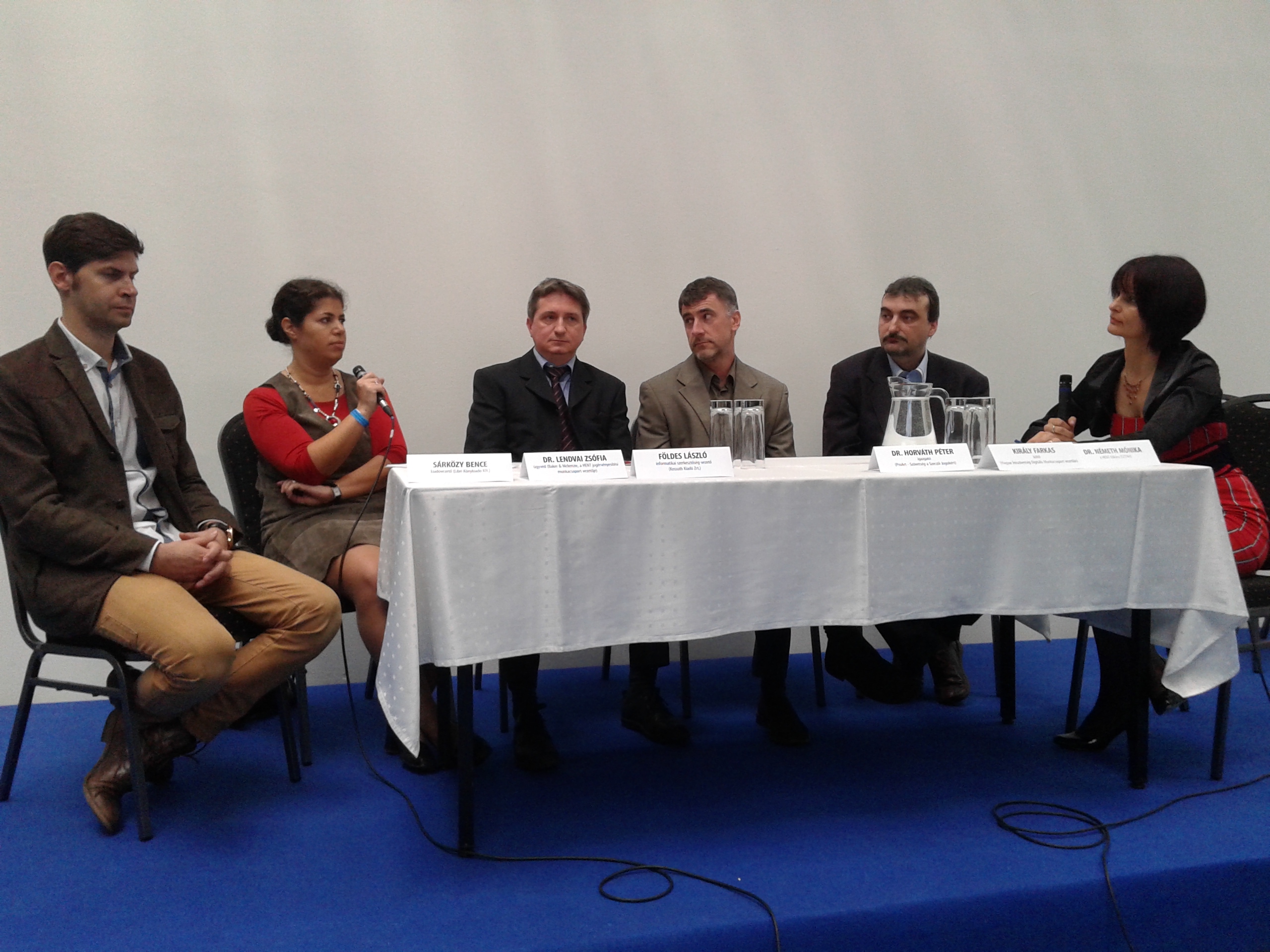 Németh Mónika, a Hamisítás elleni Nemzeti Testület titkára moderálta az első panelbeszélgetést. Bevezetőjében elmondta – hosszú időn keresztül az információtárolás egyetlen módja a papírra vetett betű volt. Ma már adatot tárolunk szervereken, felhőkben, megváltoztatva munkánkat és szabadidőnket, szokásainkat, sőt magánéletünket is. A „Gutenberg Project”, Michael S. Hart vállalkozása 1971-ben, már egy digitalizálási projektnek tekinthető, melynek célja az volt, hogy a lehető legtöbb kulturális dokumentumokat tegyenek ingyenesen hozzáférhetővé. – Ez nevezhető a legelső digitális könyvtárnak, az „eBook” elnevezés pedig 1998 óta használatos – tette hozzá a moderátor. Míg a digitális könyvek eladási mutatói 2008-2010 között az USA-ban több száz százalékkal növekedtek, ezzel 0,6 százalékról 6,4 százalékra gyarapítva részesedésüket a teljes könyvpiacból, ugyanebben az időszakban Európában és ezen belül Magyarországon a könyvpiaci részesedés még mindig 1 százalék alatt járt – hívta fel a figyelmet a tengerentúli tendenciára bevezetőjében Németh Mónika. – A hazai digitális könyveladás ugyanekkor 412 millió Ft körül alakult, amely a teljes forgalom 0,7 százaléka – tette hozz –, ebben a mutatóban hazánk ugyan Amerikától jelentősen elmarad, ám Európa többi országától nem.
